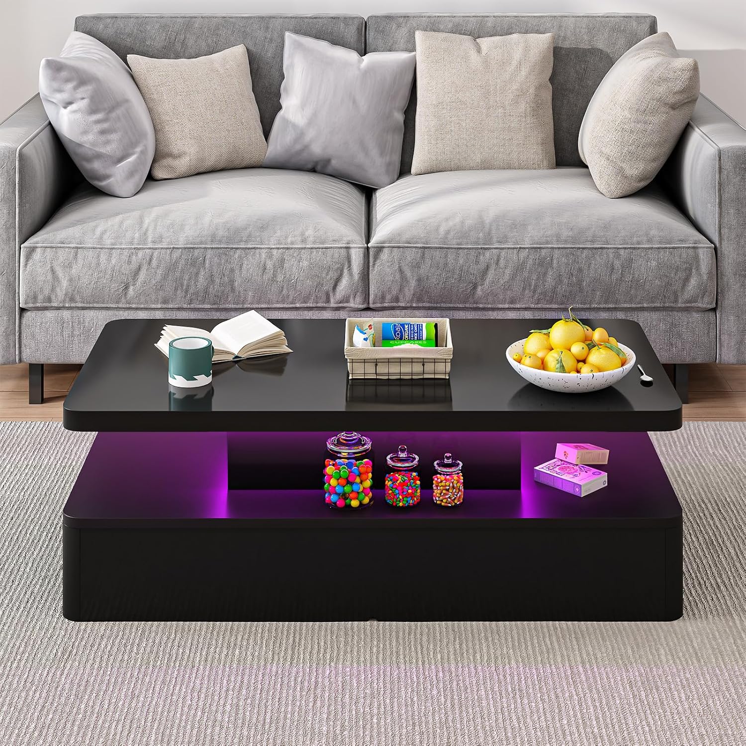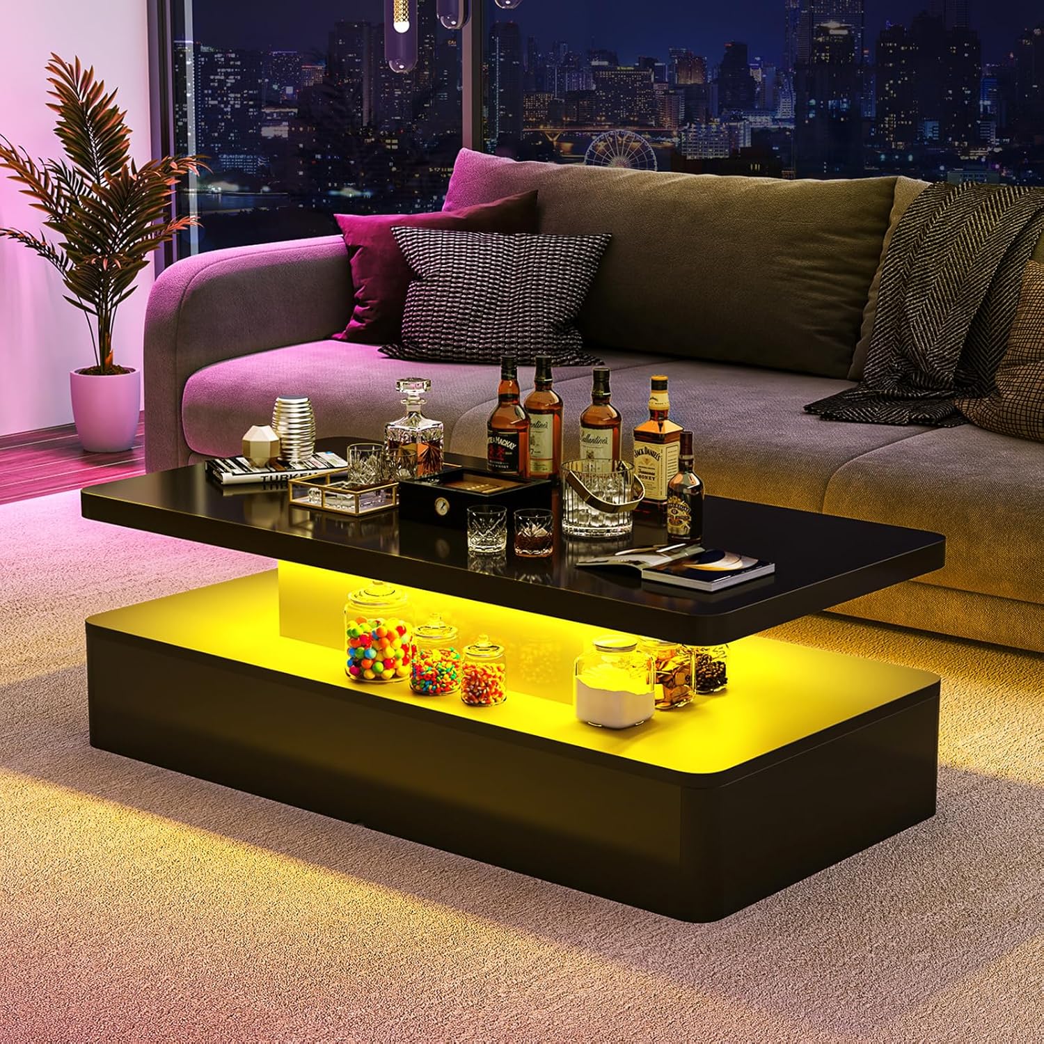 Crafted in a timeless black finish, this stylish coffee table is sure to elevate your decor and become the focal point of any room. Whether you’re entertaining guests or simply relaxing at home, the Oneinmil LED Coffee Table adds a touch of modern elegance to your living space.